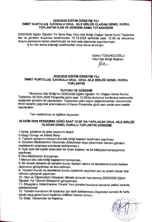 Milli Eğitim Bakanlığı Okul- Aile Birliği Yönetmeliği’nin 7-(1) Maddesine göre okul yöneticileri, öğretmenler ve veliler Okul- Aile Birliğinin tabiî üyesidir. Okul Aile Birliğimizin yıllık Olağan Genel Kurul toplantısı T.C. Milli Eğitim Bakanlığı Strateji Geliştirme Başkanlığı’nın 15/10/2020 tarih, 14890597 sayı ve Okul Aile Birliği Toplantıları konulu resmi yazıları doğrultusunda 30 Ekim 2025 Perşembe günü saat 12.00’da, aşağıdaki gündem maddelerini görüşmek üzere okulumuz konferans salonunda yapılacaktır. Okul – Aile arasındaki bütünleşmenin gerçekleştirilmesi, veli ve okul arasındaki iletişimi güçlendirmesi, eğitim – öğretimi geliştirici faaliyetlerin desteklenmesinde büyük anlam taşıyan, bu toplantıya tüm velilerimizin katılımını bekler, sağlık ve mutluluklar dileriz.