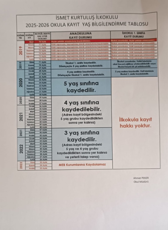 2025-2026 OKULA KAYIT YAŞ BİLGİLENDİRME TABLOSU
